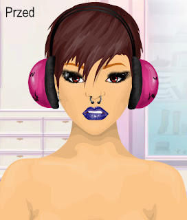 Przed: Hm... Chyba trochę przesadziłaś z tym makijażem. :P Lekko pomalowane powieki na czarno zdecydowanie by wystarczyły + fioletowa szminka, bo niebieska trochę nie pasuje. Osobiście fanką piercingu nie jestem, ale jeśli Tobie się podoba - to najważniejsze. ;D